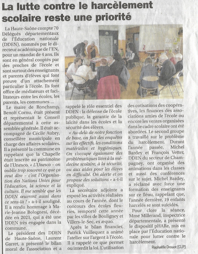 La Haute-Saône compte 70 Délégués départementaux de l’Éducation nationale (DDEN), nommés par le directeur académique de l’EN, pour un mandat de 4 ans. Ils sont en général cooptés par des proches de l’école et sont surtout des enseignants et parents d’élèves qui font preuve d’un attachement particulier à l’école. Ils font office de médiateurs et facilitateurs entre les écoles, les parents, les communes …
